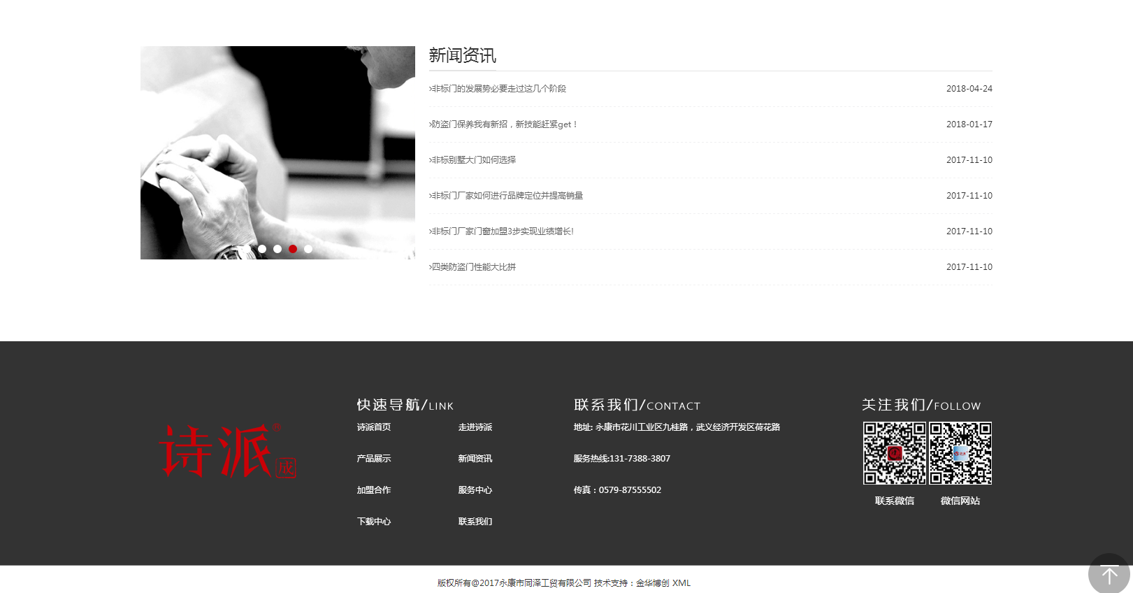 詩(shī)派,是永康同澤工貿(mào)有限公司的旗下公司,集研發(fā)、制造、營(yíng)銷和配套服務(wù)為一體,產(chǎn)品涵蓋室內(nèi)門(鋼木門、深拉伸仿實(shí)木門、純實(shí)木門、實(shí)木復(fù)合門、強(qiáng)化木門),戶外進(jìn)戶門(防盜門、非標(biāo)門、標(biāo)準(zhǔn)門、鋼質(zhì)門、不銹鋼門、防火門、銅門)等。